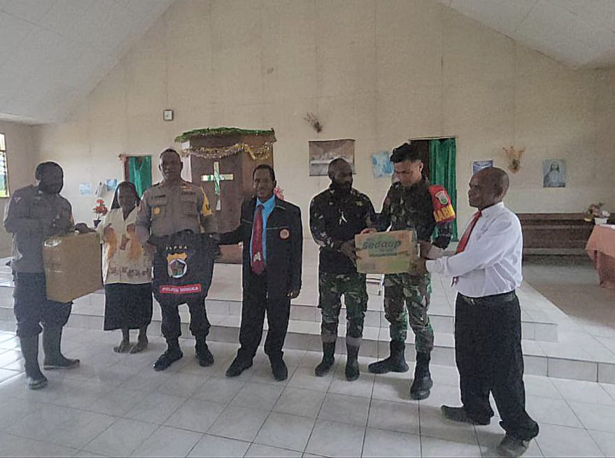 Timika, suaraindo24.com – Babinsa Koramil 1710-05/Jila Pratu Yanto Mogo bersama Bhabinkamtibmas setempat melaksanakan kegiatan Bakti Sosial (Baksos) pemberian bantuan Sembako kepada pihak Gereja Katolik St. Stevanus Kp. Naemun Distrik Jila, Kab. Mimika, Senin (24/03/2025).