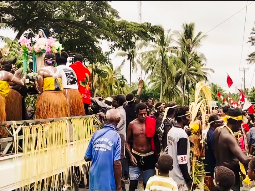 Arak-arakan dimulai dari ujung Kampung Pigapu, menyusuri jalan Kampung hingga berakhir di Gereja Katolik St. Santo Paulus Pigapu yang diikuti ratusan umat dan warga. Sabtu (10/5/2025).