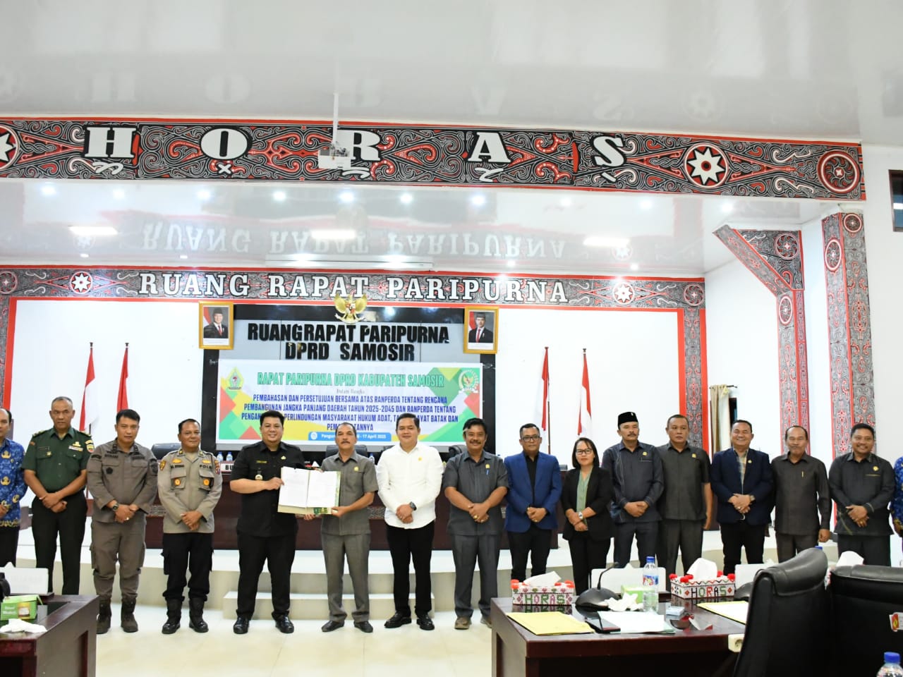 Samosir – Pemerintah Kabupaten (Pemkab) Samosir bersama DPRD menyepakati 2 (dua) buah Rancangan Peraturan Daerah (Ranperda) untuk ditetapkan menjadi peraturan daerah (Perda). Kedua Ranperda tersebut adalah Ranperda tentang Rencana Pembangunan Jangka Panjang Daerah (RPJPD) Kabupaten Samosir Tahun 2025-2045 dan Ranperda tentang Pengakuan dan Perlindungan Masyarakat Hukum Adat, Tanah Ulayat Batak dan Pemanfaatannya.