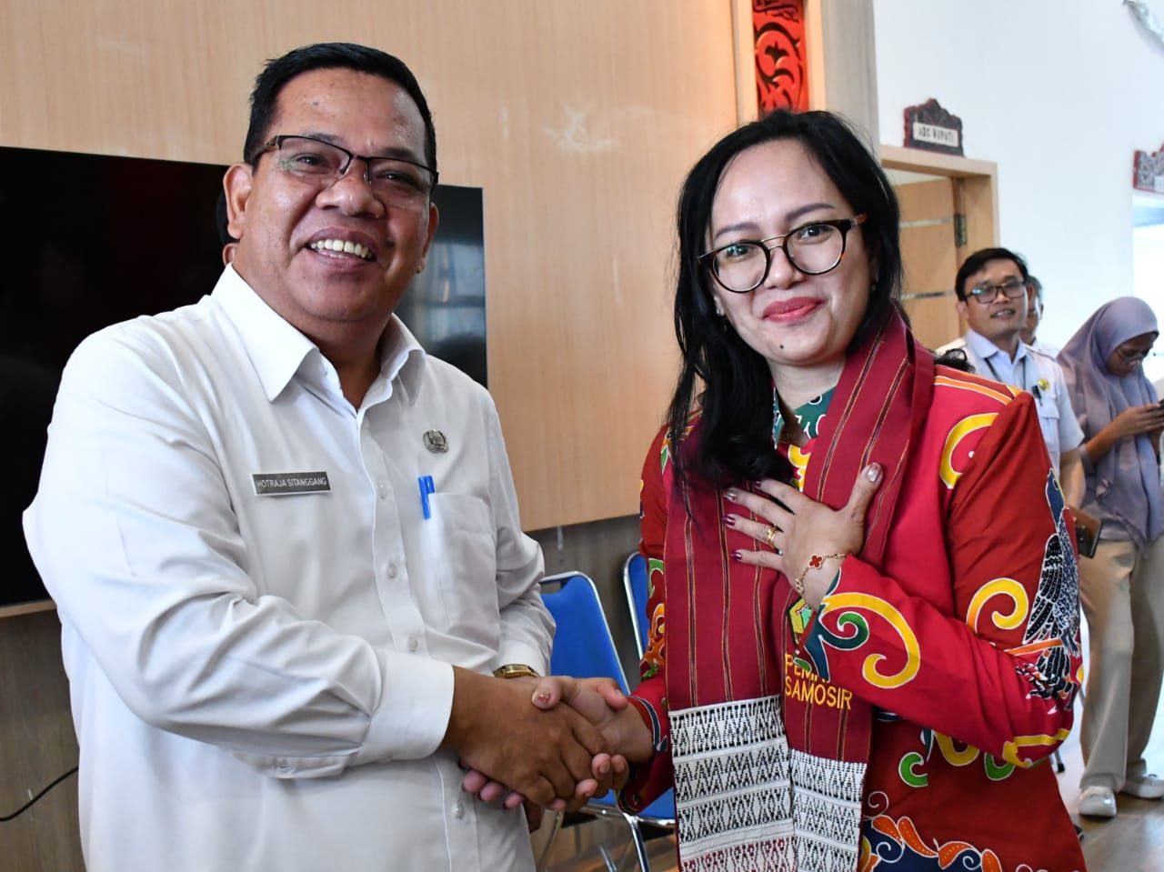 Samosir – Wakil Bupati Samosir Ariston Tua Sidauruk, SE, MM didampingi oleh Asisten II Hotraja Sitanggang, Kadis Ketapang dan Pertanian Tumiur Gutom, Kadis Sosial PMD F. Agust Karokaro, bersama OPD teknis, menerima kunjungan Tim Bappenas dan UKFCDO (United Kingdom Foreign, Commonwealth and Development Office/Kedutaan Inggris), Tim Kemendagri, dan Bappeda Provsu di Lobby Lt. II Kantor Bupati Samosir, Rabu (19/3/2025).