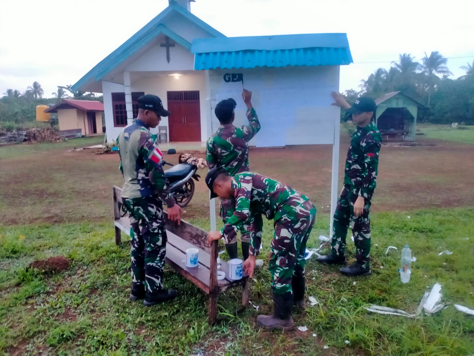Selain bergotong royong membuat papan nama, personel Satgas bersama warga melakukan pembersihan lingkungan gereja sebagai wujud kebersamaan dan toleransi kehidupan beragama yang rukun dan saling menghormati.