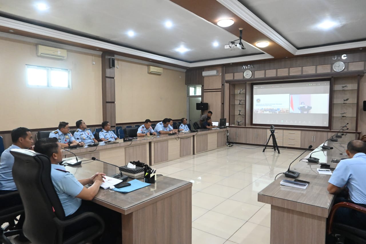 Makassar – Danlanud Sultan Hasanuddin Marsma TNI Arifaini Nur Dwiyanto, M.Han., didampingi para pejabat Lanud Sultan Hasanuddin mengikuti Rapat Kerja Teknis (Rakernis) Komando Daerah TNI Angkatan Udara II (Kodau II) secara virtual di Ruang Rapat Mako Lanud Sultan Hasanuddin, Senin (23/2/2026).