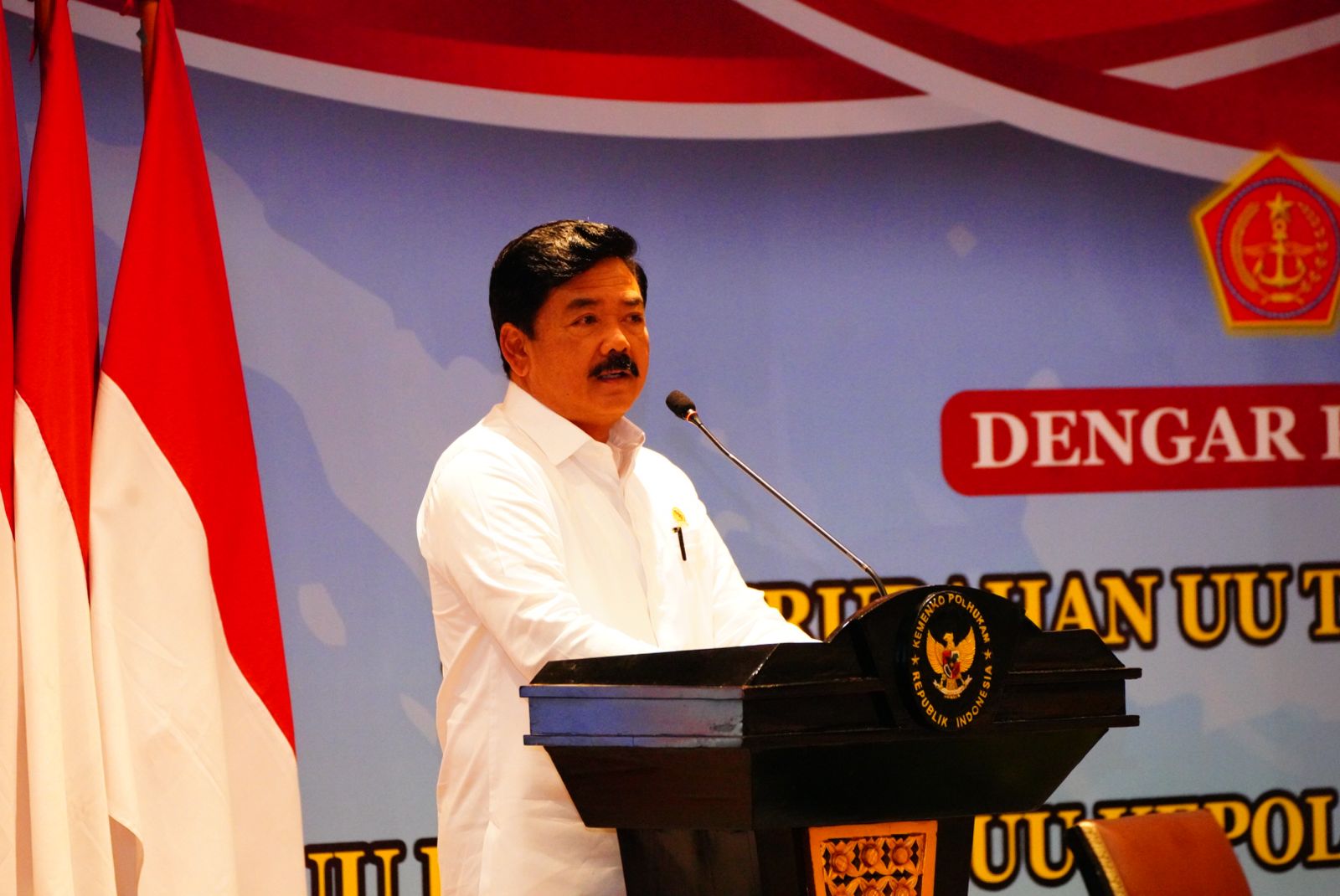 Jakarta – Kepala Badan Pembinaan Hukum (Kababinkum) TNI Laksda TNI Kresno Buntoro, S.H., LLM., Ph.D., menghadiri Dengar Pendapat Publik RUU Perubahan UU TNI dan RUU Perubahan UU Polri yang dibuka oleh Menkopolhukam Hadi Tjahjanto, bertempat di Hotel Borobudur, Jakarta Pusat, Kamis (11/7/2024).