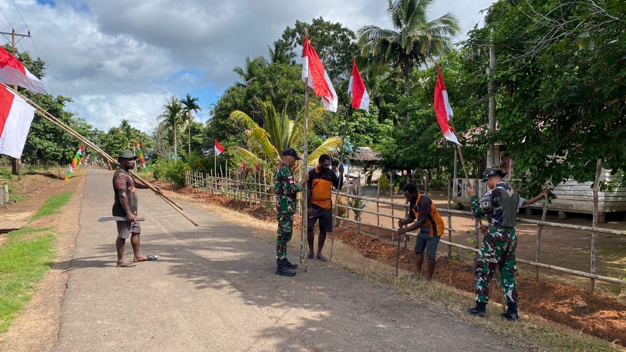Merauke – Dalam rangka menyambut dan memeriahkan suasana hari ulang tahun kemerdekaan Republik Indonesia ke-79 tahun 2024 dan sebagai wujud kecintaan masyarakat terhadap NKRI, Satgas Pamtas Yonif 726/Tml melaksanakan karya bhakti, memasang umbul-umbul dan bendera merah putih bersama warga Kampung Kweel, Distrik Eligobel, Kab. Merauke, Senin (05/08/2024).