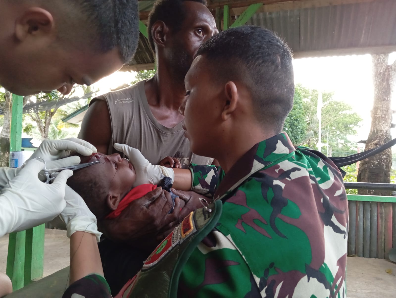 Pada sore hari tampak seorang mama yang menggendong anaknya datang ke Pos Kalimaro, dengan penuh kecemasan karena anaknya mengalami luka robek di bagian kepala akibat terkena lemparan batu oleh kakaknya. Menanggapi hal tersebut, personel Satgas Serda Ardiansyah (Bakes) Pos Kalimaro dengan sigap dan cekatan memberikan pertolongan kepada sang anak yang memiliki panggilan Aris.