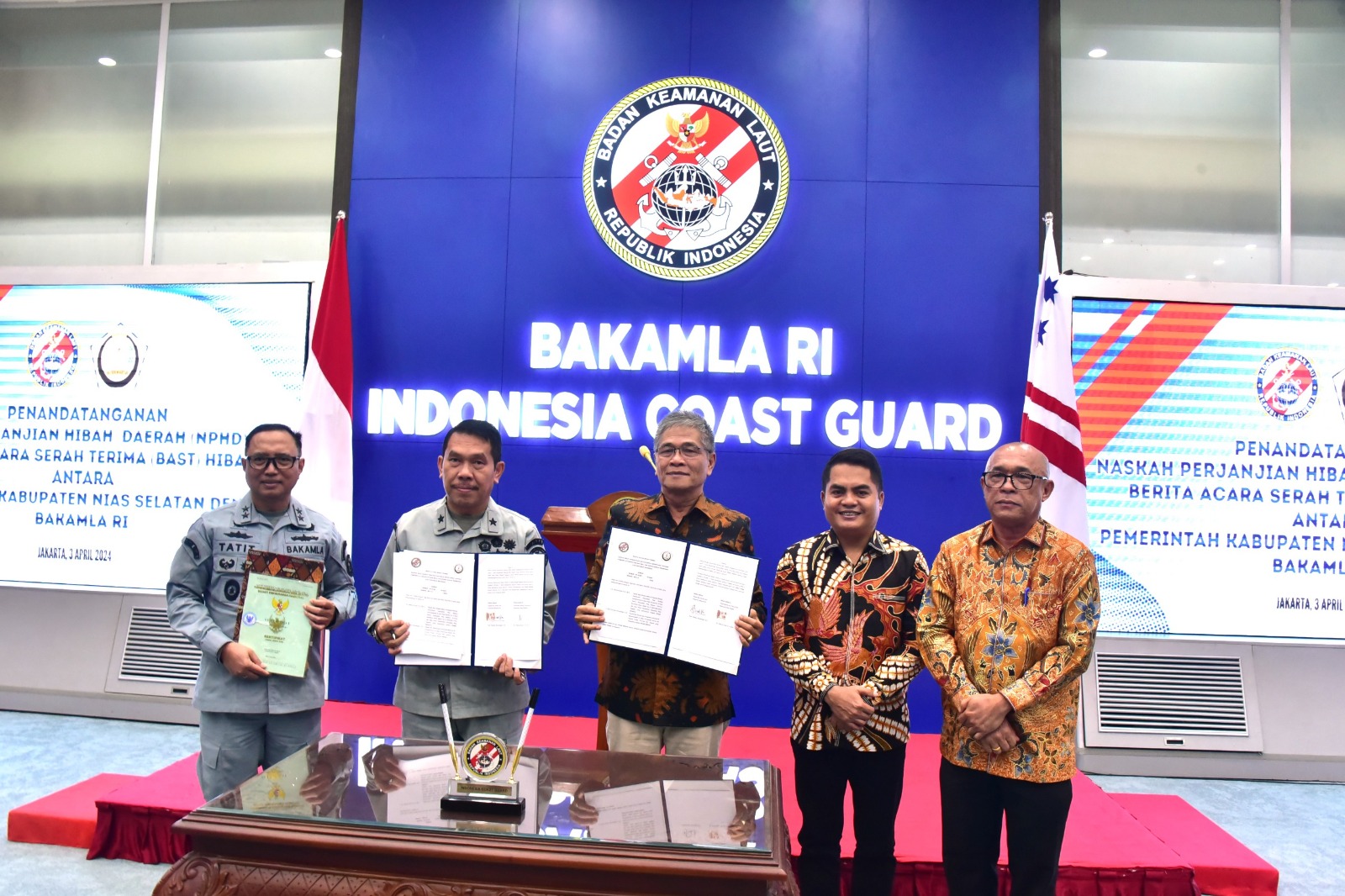 Jakarta – Bakamla RI menerima hibah tanah dengan luas 13.560 m2 dan 2 (dua) bangunan seluas 400 m2 dan 168 m2 dari Pemerintah Kabupaten Nias Selatan. Hibah tersebut secara resmi diterima oleh Bakamla RI melalui Penandatangan Naskah Perjanjian Hibah Daerah (NPHD) dan Berita Acara Serah Terima, di Aula Ary Hasibuan Mabes Bakamla RI, Jakarta Pusat, pada Rabu (03/04/2024).