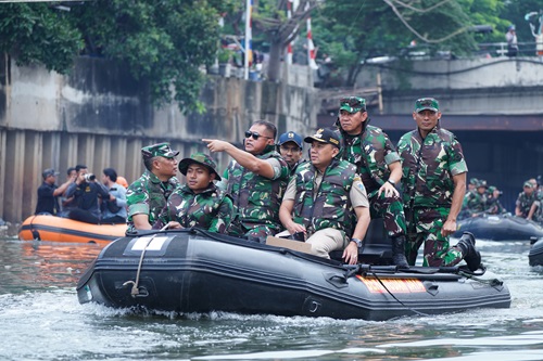 Jakarta – Panglima TNI Jenderal TNI Agus Subiyanto diwakili Kasad Jenderal TNI Maruli Simanjuntak meninjau kegiatan Karya Bakti Pembersihan Sungai Ciliwung dalam rangkaian HUT Ke-79 TNI Tahun 2024, bertempat di Sungai Ciliwung Jembatan Besi Sektor Tambora, Jakarta Barat, Minggu (13/10/2024).