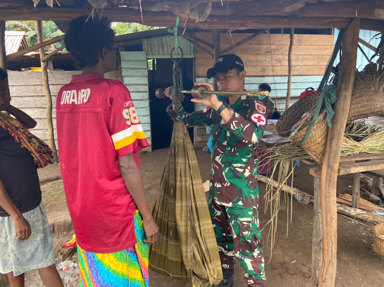 Perwakilan 5 orang personel dari Pos Yakyu salah satu diantaranya Prada Paisal, sebagai personel kesehatan Satgas bersama Nakes dari Puskesmas, melakukan penimbangan berat dan tinggi badan, ibu hamil dan Balita di lanjutkan pemberian imunisasi dan vitamin, ujar Daud Gebjay, A.Mk. (Kepala Puskesmas Sota).